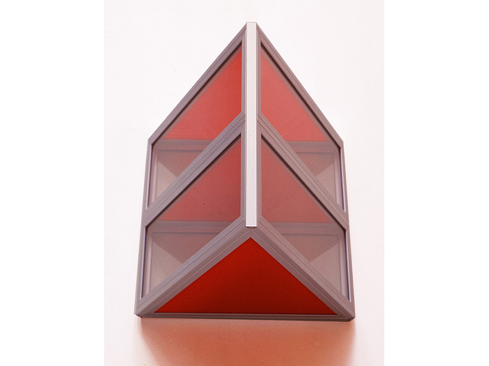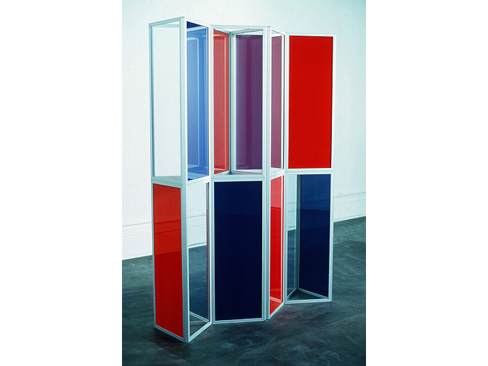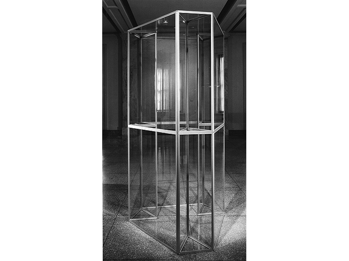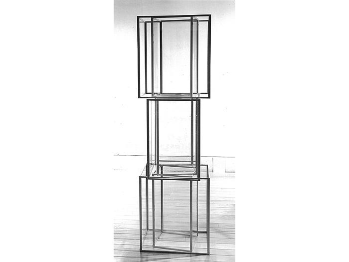 In 1967, Colin discovered the reflective quality of aluminum-edged clear glass. The combination of a subtle ambiquity of reflections (or extensions) of the aluminum edges into the surrounding space, formed both a real and illusionary experience. Colin wrote, "The glass became not only a volume-space study, but also a study of the question of observed reality versus known reality. The spatial extensions of the pieces are carried both into the piece and beyond the physical limits of the piece through echoes of the aluminum edges."