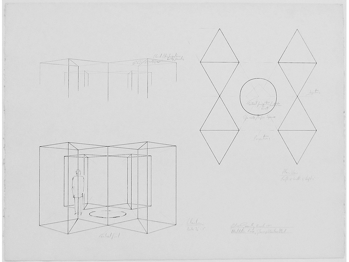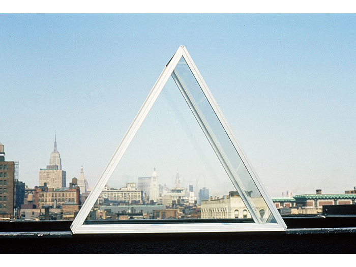 "What Albers has done for the square, Greenly may yet do for the triangle. Two new glass and aluminum sculptures exploit it in multiple combinations. The most intriguing work is a scale model for a proposed monument, one of the most exciting yet designed by a contemporary sculptor. If built, it would consist of six triangular, 21-ft. high columns of sheer glass, arranged so that a spectator could walk among them and experience a shimmering infinity of reflections."