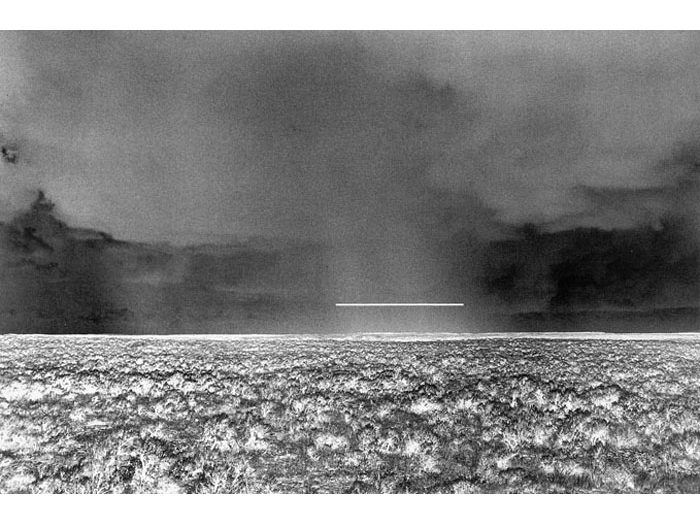 Realizing the superior impact of photography in creating an illusion to natural reality, he soon used photographs to achieve the images he sought. Over photographic images of landscapes, Greenly imposed abstract "energy" of apparently great scale, creating "intangible sculpture". Above these real, but generalized, poetic landscapes are "bars", clearly incorporeal, which set up an almost electrical tension or exchange of energy with the land below. Clearly, these works are part of the same search that led to the discovery of the Primary Transitional Symbol. Nature, space, energy, time, and spirit are united in each work to build an art form that is endlessly evocative and free from the struggles of the ego that created or perceives it."