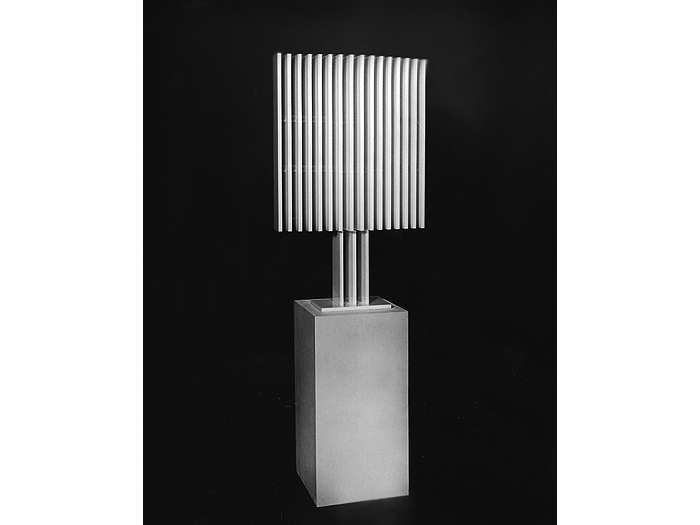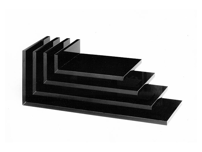 By 1964, Colin began to look for a way to eliminate the support bases of his acrylic sculptures and turned to creating rectangular progressions on a somewhat larger scale. He created 14 small-scale edition pieces as models with the eventual goal of making large-scale sculptures. Thickness limitations of the acrylic sheet material led him toward the use of painted polystyrene as a lighter weight, scalable solution.