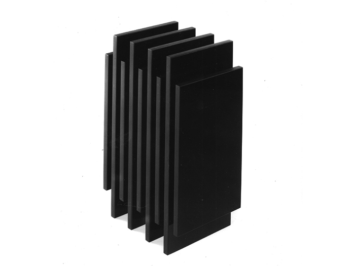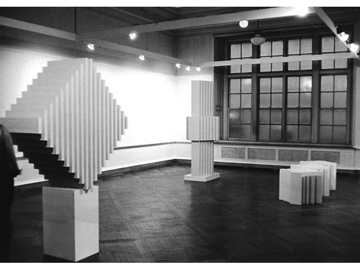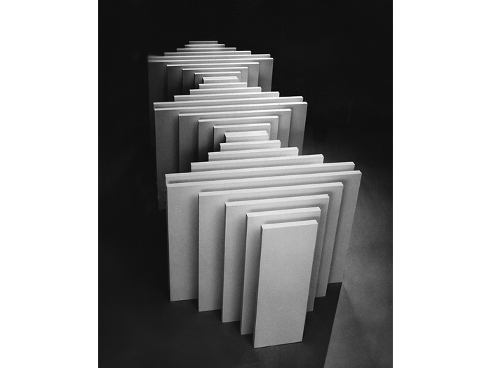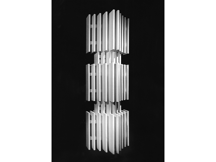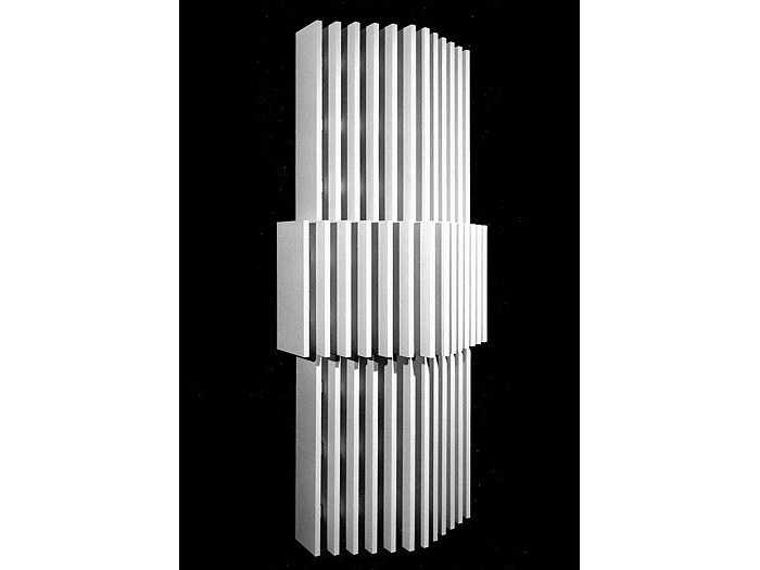 "...To create a compact sculptural unit, he organized a progression of superimposed forms in parallel planes, keeping each form separated from the next by narrow open space, Thus, the work assumed a life of its own through subtle and gradual changes of light reflected in between and on each form. This effect emphasized the transitional quality of the shape. This use of light appeared in his work as early as 1961 in a series of relief paintings and was continued in the polystyrene pieces of the next period of his work. Initially the works were either entirely white, although, the artist points out, not white alone, as the reflected light breaks down into various colors - or wholly black.