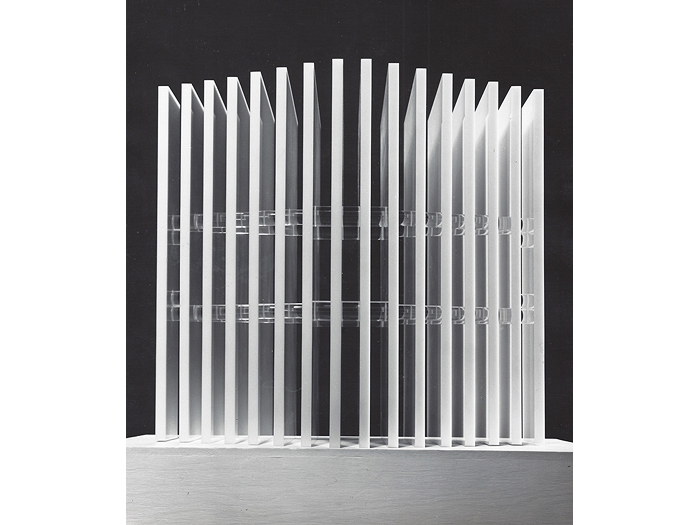 ...In the straight-line polystyrene works, Greenly proceeded to create forms which were more stable than the proceeding supercircles....In these works, as in the acrylic pieces, the artist assembled each work as a unified series of spaced, light-reflecting progressions."