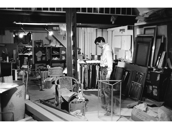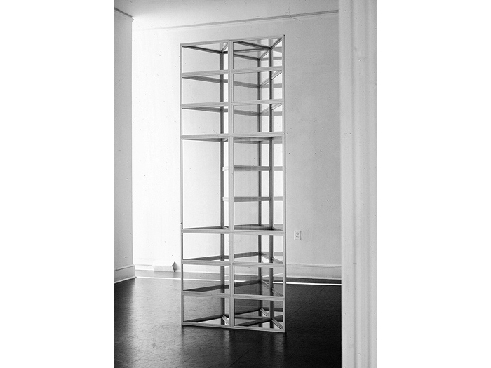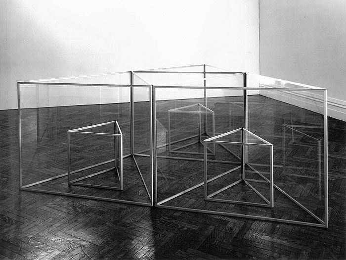 In 1967, Colin discovered the reflective quality of aluminum-edged clear glass. The combination of a subtle ambiquity of reflections (or extensions) of the aluminum edges into the surrounding space, formed both a real and illusionary experience. Colin wrote, "The glass became not only a volume-space study, but also a study of the question of observed reality versus known reality. The spatial extensions of the pieces are carried both into the piece and beyond the physical limits of the piece through echoes of the aluminum edges."