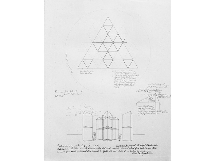 "What Albers has done for the square, Greenly may yet do for the triangle. Two new glass and aluminum sculptures exploit it in multiple combinations. The most intriguing work is a scale model for a proposed monument, one of the most exciting yet designed by a contemporary sculptor. If built, it would consist of six triangular, 21-ft. high columns of sheer glass, arranged so that a spectator could walk among them and experience a shimmering infinity of reflections."