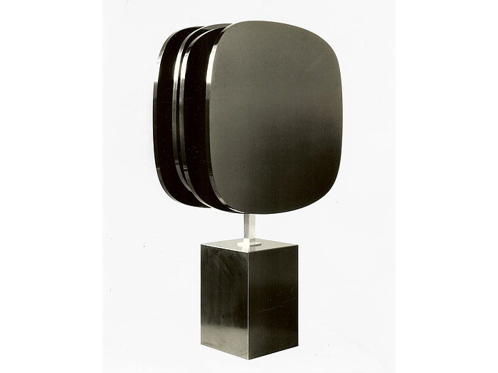 "...To create a compact sculptural unit, he organized a progression of superimposed forms in parallel planes, keeping each form separated from the next by narrow open space, Thus, the work assumed a life of its own through subtle and gradual changes of light reflected in between and on each form. This effect emphasized the transitional quality of the shape. This use of light appeared in his work as early as 1961 in a series of relief paintings and was continued in the polystyrene pieces of the next period of his work. Initially the works were either entirely white, although, the artist points out, not white alone, as the reflected light breaks down into various colors - or wholly black.